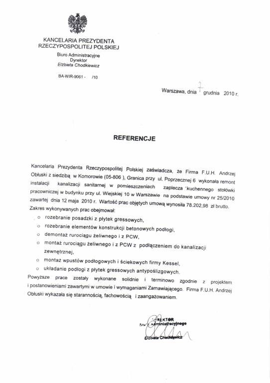 Nasza firma cieszy się uznaniem zarówno wśród klientów prywatnych, jak i instytucji publicznych, co potwierdzają liczne referencje. Jednym z naszych kluczowych projektów była realizacja dla Kancelarii Prezydenta Rzeczypospolitej Polskiej, co świadczy o najwyższym poziomie zaufania do naszych usług.